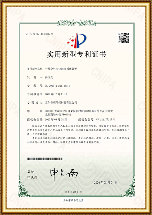 實用新型專利證書(一種空氣凈化通風(fēng)循環(huán)裝置